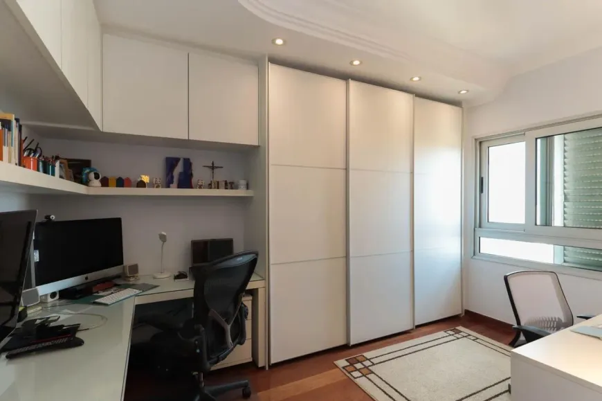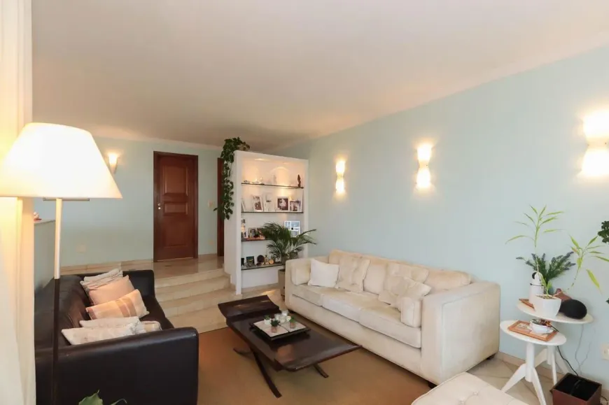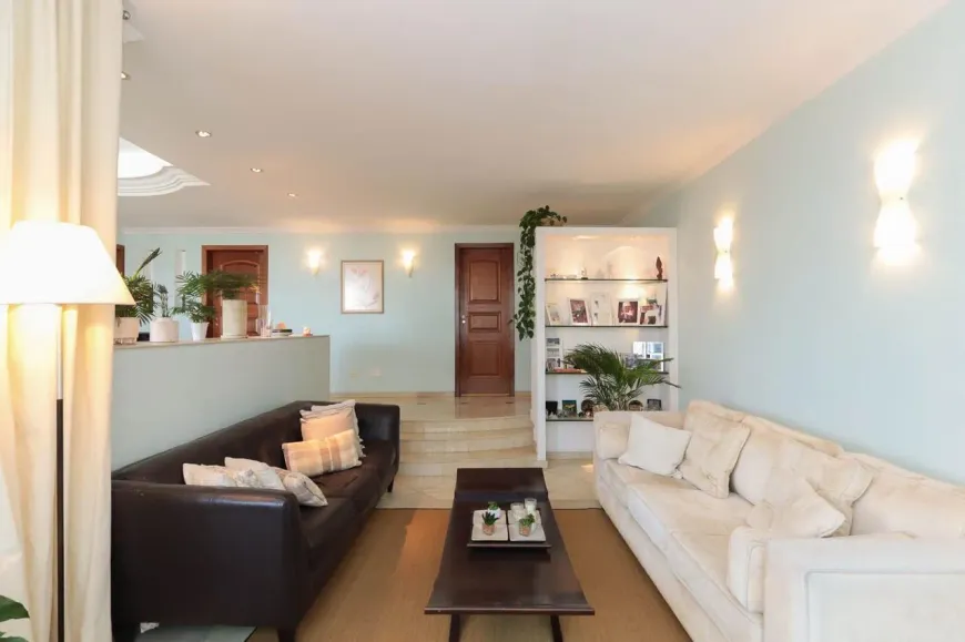 São três suítes e cinco banheiros distribuídos em um projeto que privilegia amplitude, luminosidade e fluidez entre os ambientes.
